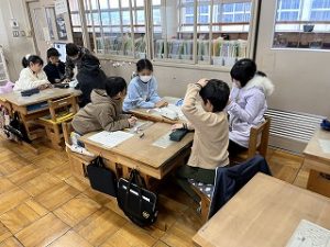 冬休みの楽しい思い出をクイズ形式にしてみんなで共有しました。4つのうち1つはウソの問題を作ります。聞き手は、そのウソを見破るというルールです。質問してもかまいません。みんなウソが見破られないように工夫して上手に発表しました。