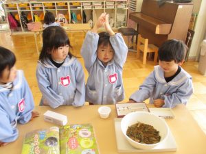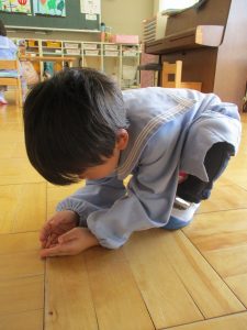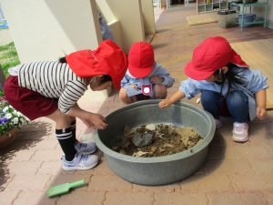 年少児は、入園して一週間が経ちました。園での生活の流れにも少しずつ慣れ、天気の良い日は戸外遊びを楽しんでいます。暖かくなり、園庭に様々な生き物が現れるようになり、今はダンゴムシに夢中です。