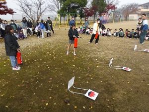 また、4年生から6年生は、水消火器を使った消火訓練にも取り組みました。消防士の方の指導を受け、消火器の正しい使い方を知るだけでなく、実際に体験することで、火災時の初期消火の大切さを学ぶことができました。