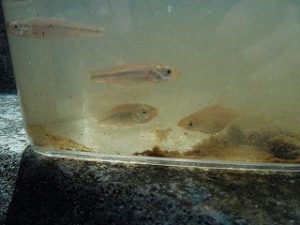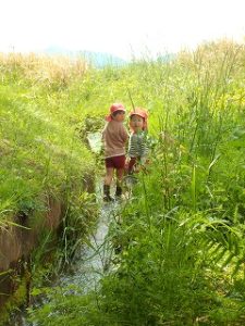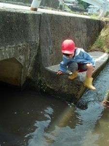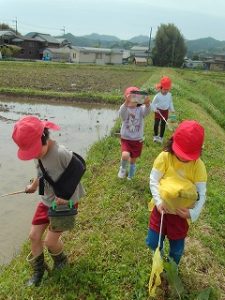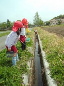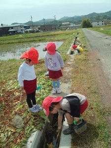 それだけではありません。岡野幼稚園の近くには魚もいるんです!年長組が魚がいる場所を年少組に教えて一緒に魚を捕ることを楽しんでいます。