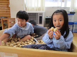 年長組が育てたお米を収穫したり、篠山産業高校でブドウ狩り体験をしたり、芋掘りをしたりして、秋の収穫祭りを楽しみました。