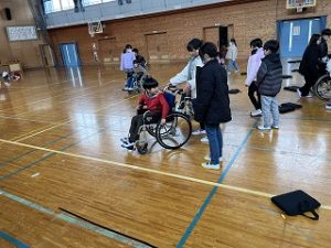 総合的な学習の時間に「福祉」について学んでいます。16日(火)の5,6校時に社会福祉協議会の方から車いすの使い方、車イスに乗った方にどう接すればいいのかや相手を思いやる気持ちの大切さなどを教えていただきました。「坂を降りる時に、ゆっくりブレーキをかけながら行かないといけないから大変だった。」「車いすに乗ってて怖かったけど、押してくれる人が「坂登るで!」と言ってくれたから怖くなかった」など今まで気づかなかった視点を子どもたちも持つことができ、学び多き一日となりました。